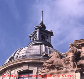 The main entrance is flanked by two ships` prows, complete with anchors, and above them are four columns which support a pediment. Within this is Poseidon (the Greek god of the sea) being paid homage, while on top he is shown with seahorses. To the left of the pediment is a statue of Thomas Telford (with dividers), and to the right are James Watt (with a steam condenser) and Henry Bell (with a model of his Comet steamboat). Above these statues are plaques and sets of `grown-up` cherubs holding various objects. Two of the plaques feature the city`s coat of arms, while the plaque above Bell has the Trust`s symbol (a lighthouse) representing Glasgow`s connections with the sea. The main feature of the cornerpiece is the dome which rises above six fluted columns; grotesque faces decorate the base of the dome. There are two superb sculptures at roof level: on the left is Europa (the daughter of the king of Tyre) leading a bull (in reality, Zeus, chief of the gods, in disguise) and on the right is Amphitrite (wife of Poseidon), with trident in hand, driving a pair of seahorses. Below Europa is St Mungo with the city`s coat of arms and a globe, which represents Glasgow`s world-wide shipping interests. A similar sculpture is below Amphitrite. This article is based on the guidebook "The Glasgow Guide". Back to the main description of the building. |