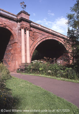 | 1899-1901, Charles Formans This very grand bridge carries a road high above the River Kelvin and the Botanic Gardens and is one of the city`s finest bridges. The bulk of it is made of good-quality red sandstone, with polished pink granite used for the Ionic columns and the balustrades. The city`s coat of arms decorate the spandrels. The bridge`s foundation stone is on the other side of the river from the Botanic Gardens. Below one of the decorative granite pillars is a large block of sandstone which carries the inscription Corporation of Glasgow Kirklee Bridge Memorial Stone Laid by Councillor John McFarlane J.P. Chairman of the Statute Labour Committee 17th January 1900 Hon Samuel Chisholm Lord Provost of this city. Another face of the block has the words William Wilson contractor on it. This article is based on the guidebook "The Glasgow Guide". |  |