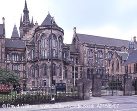 The Hunterian Museum is sited at the back of the university`s Main Buildings. The first room occupies the top half of the large round tower near the centre of this picture. The other galleries are to the left and right of this. |