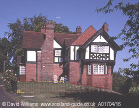 Miller) A plaque explains: These buildings are facsimiles of two cottages at Port Sunlight [near Liverpool], occupied by the employees of Lever Bros Limited and were presented by that company to the corporation of the city of Glasgow after the exhibition in 1901. These charming and very English-looking buildings, with their red bricks and carved timbers, are remarkably different to anything else in the area. They are, most unfortunately, the only surviving structures of the 1901 International Exhibition. This article is based