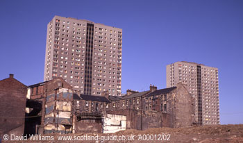 | The Comprehensive Development Areas of the 1950s and 1960s were very ambitious attempts to revitalise many of the older parts of Glasgow, and at the same time huge new housing schemes were built on farmland well outside the traditional limits of the city. `Deserts wi` windaes` was how the Glasgow comedian Billy Connolly described these new areas on the city`s outskirts. Tall skyscraper blocks of flats were erected in some of these new communities, as well as in the older (and newly redeveloped) parts of the city; the dominating height of these tall structures has radically changed the overall appearance of the city. |