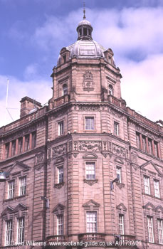 | The westward moves of both the city`s commercial interests and middle class housing went hand in hand, and at various times many of the houses of the Merchant City, Buchanan Street, Blythswood Hill and Woodlands Hill were either replaced by or converted into commercial buildings. In addition, banks and insurance companies expressed their own self-confidence in the magnificent buildings which were erected in the mid and late nineteenth century. Among the best-known bank buildings are those of the Royal Bank of Scotland in Exchange Square (1827) and Gordon Street (1853-7) and the Ingram Street banking hall of the Savings Bank of Glasgow which J. J. Burnet built in 1894-1900. Insurance companies played an important role in the development of the commercial life of the city and they also erected a number of large offices which were almost invariably embellished by numerous statues. These buildings are some of the most eye-catching pieces of Victorian architecture in the city centre and they include the Sun, Fire and Life Building (1889-94, William Leiper) and the Liverpool & London & Globe Insurance Building (1899-1901, J. B. & W. A. Thomson). Outwith the city centre, the banks erected a number of fascinating buildings; these were often deliberately placed at busy junctions and were well-endowed with elaborate carvings in order to catch the attention of passers-by. Good examples of this type of building still exist at Govan Cross (British Linen Bank) and in Cowcaddens and Anderston, both of which had branches of the Savings Bank of Glasgow. This article is based on the guidebook "The Glasgow Guide". |