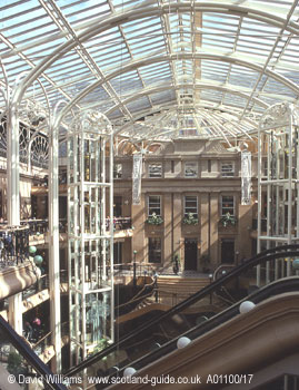 Princes Square is one of Glasgow`s best-known indoor shopping areas. It was constructed within a courtyard in the the Prince of Wales Buildings which stand on Buchanan Street, the city`s main shopping street. This imaginative piece of architecture brings modern sheltered shopping to a fine set of buildings which were built in the middle of the nineteeth century. |