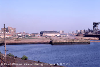 This is the Queen`s Dock in 1980 being filled in with rubble in order to provide a base for the building of the Scottish Exhibition and Conference Centre (SECC). The dock operated from 1877 to 1969. The original width of the river can be appreciated from this picture as the water stretched from beyond the left of the picture to well beyond the Finnieston Crane, the large crane on the very right of the picture. The crane stands on what became the north bank of the river. |