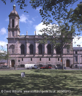 Glasgow churches are seldom decorated with statues; two of this church`s figures can be seen on the balustrade. |