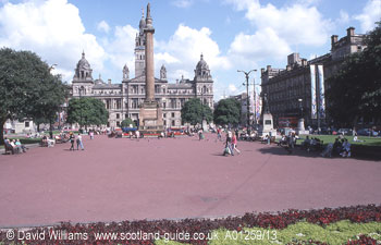 George Square, Glasgow`s main open space. The square is dominated by the very grand City Chambers, the headquarters of the city council. The tall column in the centre of the square supports a statue of Sir Walter Scott, one of Scotland`s greatest authors. Around the square are other statues of people, including Robert Burns, who have connections with the city. | |