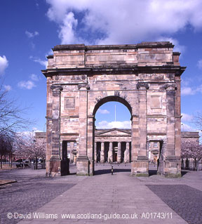 1792, Robert & James Adam The western entrance to Glasgow Green is marked by the grand McLennan Arch, which was, as inscribed high up, presented to his fellow citizens by Bailie James McLennan MP. The arch is dated MDCCCXCIII (1843) and it was originally the centrepiece of Robert Adams` Assembly Rooms in Ingram Street, which were demolished about 1890. Since then, the arch has had two other resting places near Glasgow Green before it was moved here around 1990. It has four large Ionic columns and a wide central opening which originally framed a window in the Assembly Rooms. The two plaques above the smaller openings have figures which may possibly represent music and the muses. This article is based on the guidebook "The Glasgow Guide". |