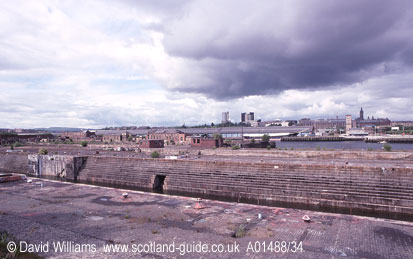 1869-98, Clyde Navigation Trust The three enormous Govan Graving Docks lie on the south side of the River Clyde in the district of Govan. The dry dock nearest the river is 168m (551 feet) long, the middle one is 175m (575 feet) long and the one farthest from the river is a massive 268m (880 feet) long; when opened in 1898 it could take the world`s largest vessels. The docks were used for fitting out ships and for ship repairs but were finally closed in 1988. Their future is still uncertain and numerous derelict dockside buildings still stand around the docks, waiting for something useful to happen. This article is based on the guidebook "The Glasgow Guide". |